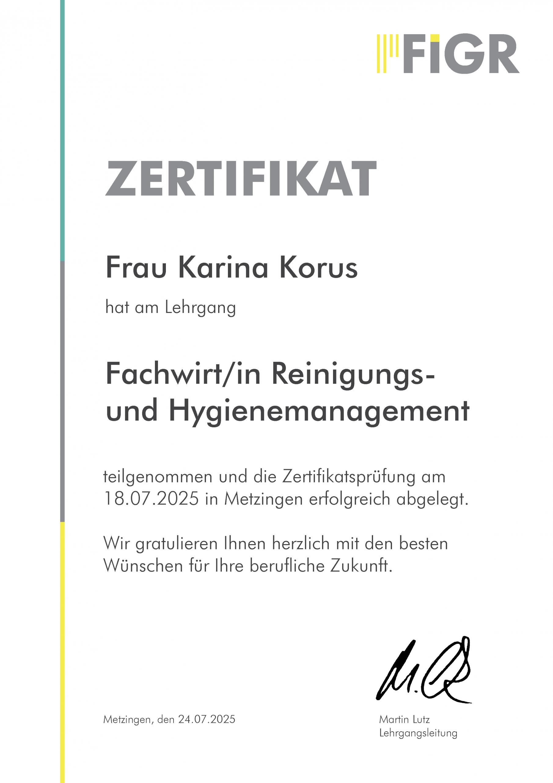 Als geprüfte Fachwirtin für Reinigung und Hygienemanagement stehe ich persönlich für zuverlässige Qualität, transparente Abläufe und höchste Sauberkeitsstandards.